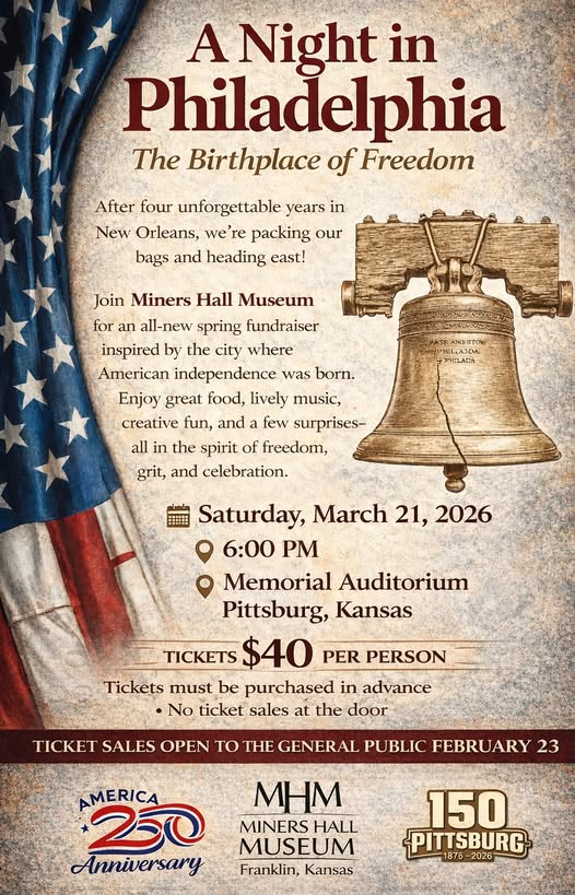 Miners Hall Museum’s fundraiser “A Night in Philadelphia” will be at6 p.m. on March 21, 2026 at Memorial Auditorium and Convention Center. Tickets will go on sale Feb. 23 through the museum by calling 620-347-4220.