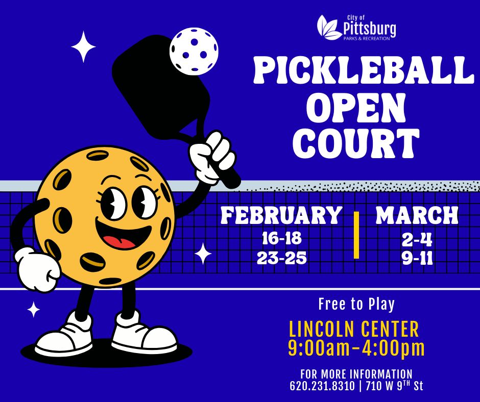 Pittsburg Parks & Recreation will have pickleball open court from 9 a.m. to 4 p.m. on March 2-4 and 9-11at the Lincoln Center 710 W 9th St. Pittsburg. Free play. All skill levels welcome. Bring your paddle!