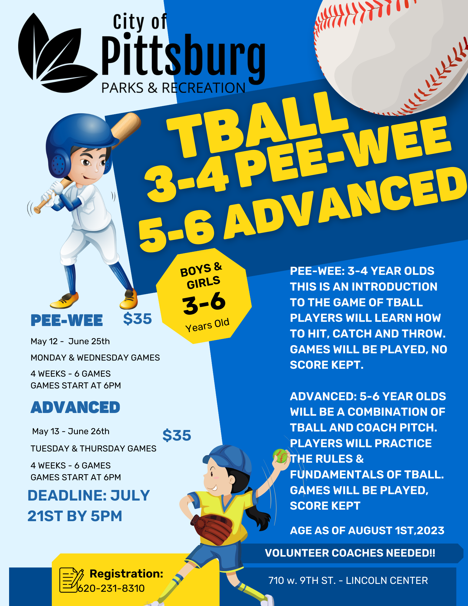 PEE-WEE: 3-4 YEAR OLDS THIS IS AN INTRODUCTION TO THE GAME OF TBALL PLAYERS WILL LEARN HOW TO HIT, CATCH AND THROW. GAMES WILL BE PLAYED, NO SCORE KEPT.