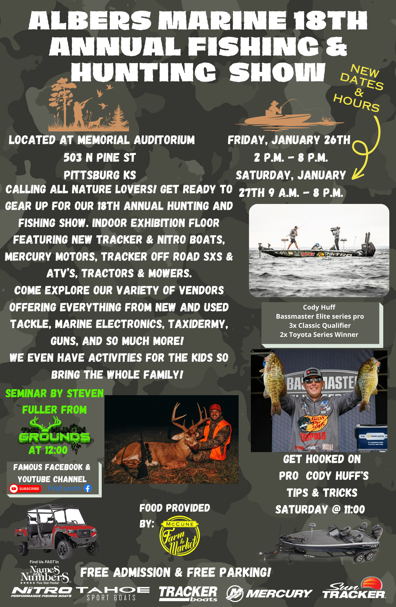 Calling all nature lovers! Get ready to gear up for our 18th Annual Hunting and Fishing Show. Indoor Exhibition floor featuring New Tracker & Nitro Boats, Mercury Motors, Tracker Off...