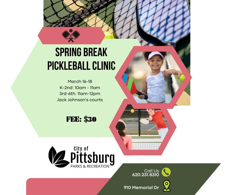 Pittsburg Parks & Recreation will host a pickleball clinic for children during spring break at Jack Johnson Court. Children in kindergarten through second grade will go at 10 – 11...