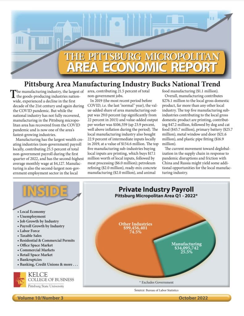 The quarterly economic update published by economist Dr. Michael Davisson of Pittsburg State University Kelce College of Business shows the local manufacturing industry has not only recovered from the COVID downturn, but is one of the region’s fastest-growing sectors. Pittsburg manufacturing has outperformed the national manufacturing industry, which has not yet fully recovered from the pandemic.